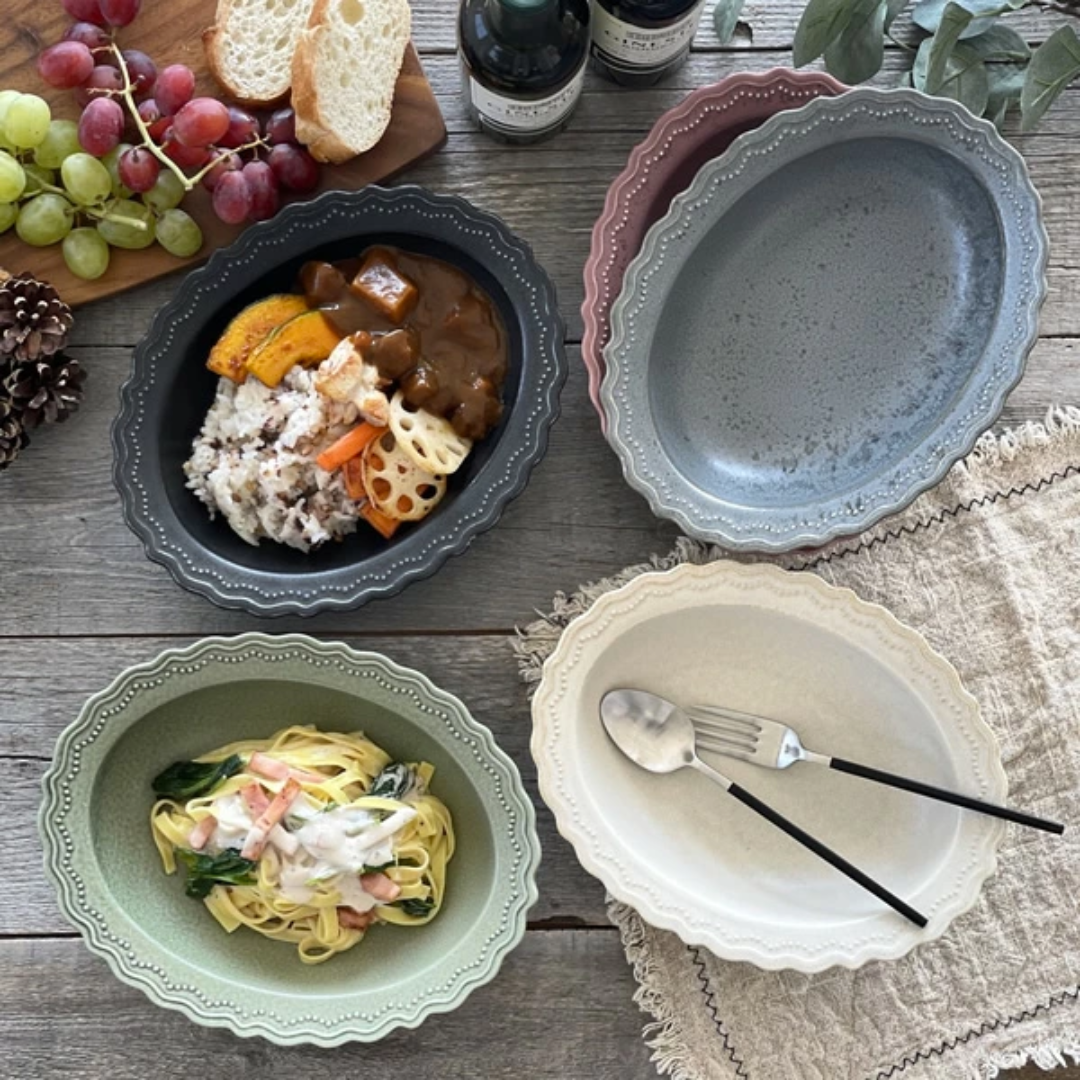 「浮雕」系列採用時尚的蕾絲狀邊緣設計,和別緻的復古色彩。精緻的波點浮雕圖案,為您的日常菜餚錦上添花。