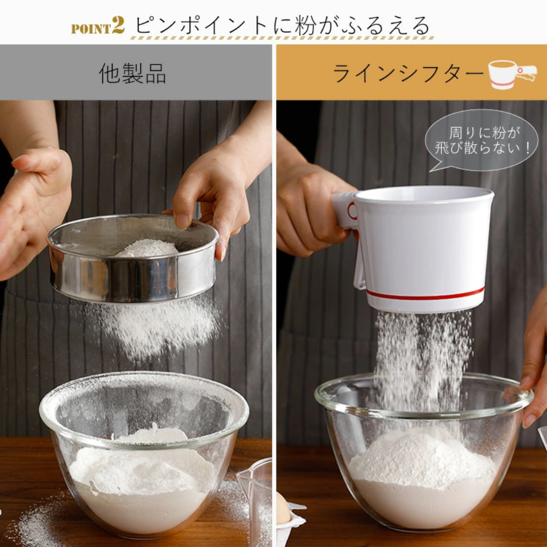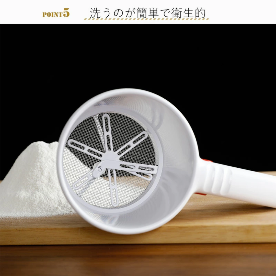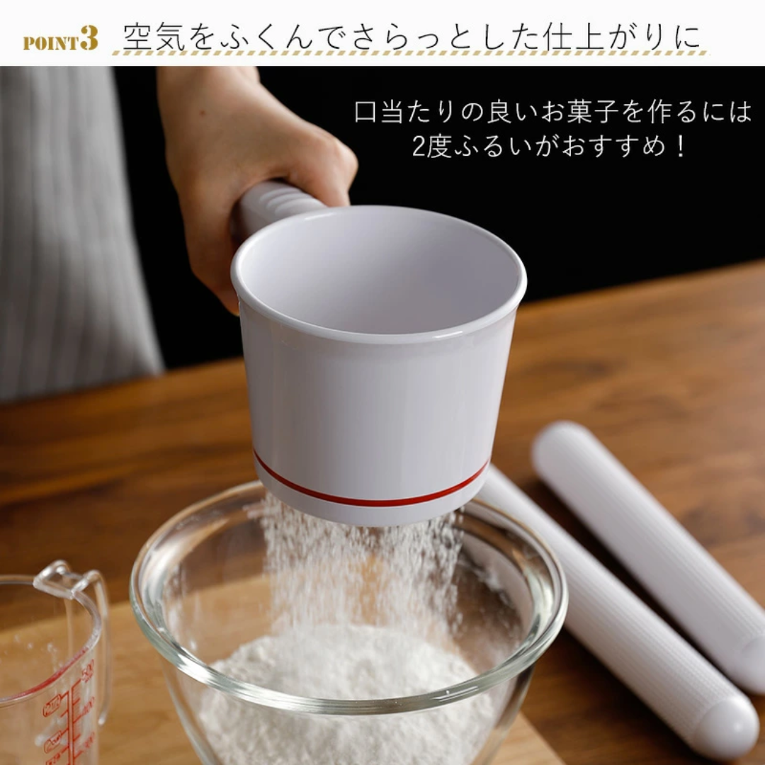 這款麵粉篩單手即可輕鬆使用。它輕巧便攜,易於清洗,而且麵粉不會四處飛濺,非常方便。過篩可以去除麵粉中的結塊和雜質,同時也能讓麵粉充分混入空氣中。這樣可以確保麵糊混合均勻,做出口感細緻的甜點。仔細過篩兩次效果更佳。