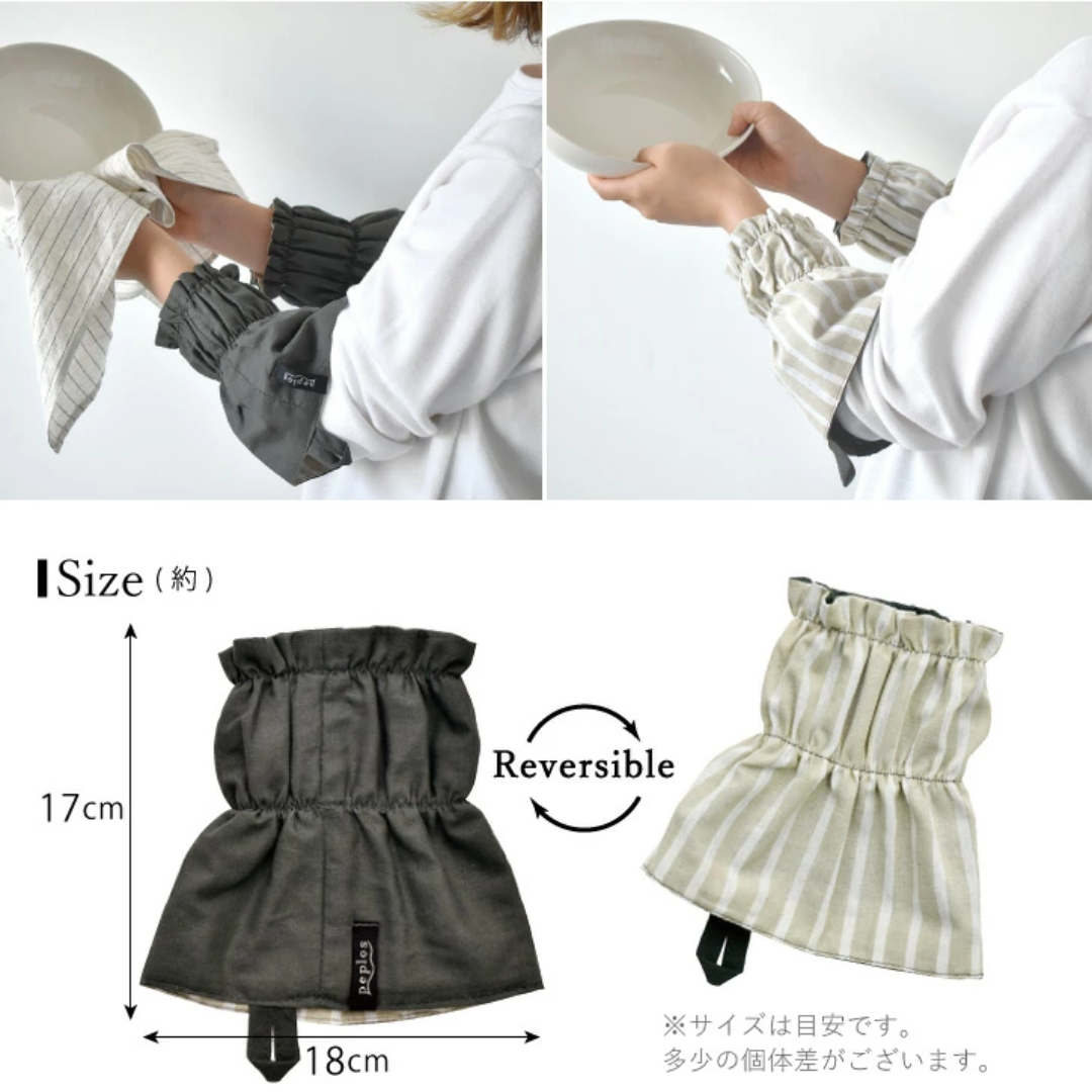 這款短袖套易於穿戴,可愛的褶皺鬆緊帶提供恰到好處的鬆緊度,將袖子牢牢固定。喇叭形下擺可與任何服裝舒適搭配,並保護袖口免受水和污垢的侵蝕。亞麻混紡布料可雙面穿著,一面是純色,另一面是條紋,讓您隨心所欲地穿著。它還配有一個掛環方便掛起收納~
