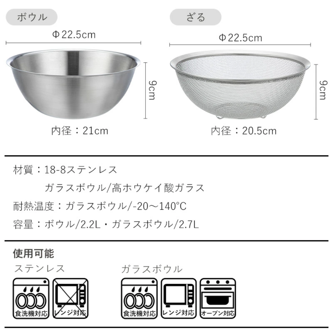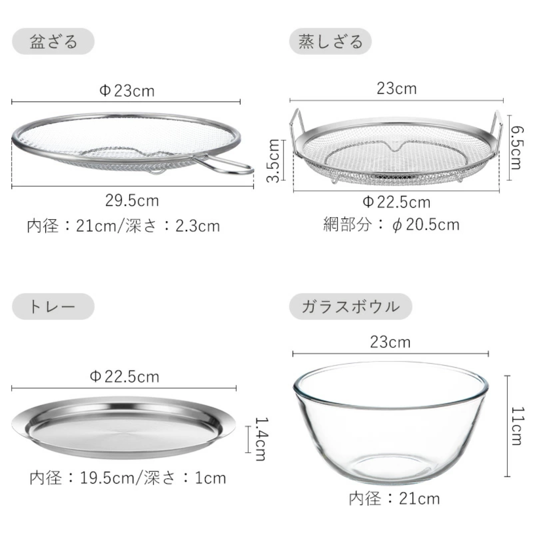 [碗式濾水籃]約 寬22.5厘米 x 高6.5厘米, 含 把手寬度約23厘米 , 深度13.50厘米高11厘米 ,內徑:約21厘米, 容量:2.7公升, 耐熱範圍:-20℃至400℃(耐熱溫差:120℃)