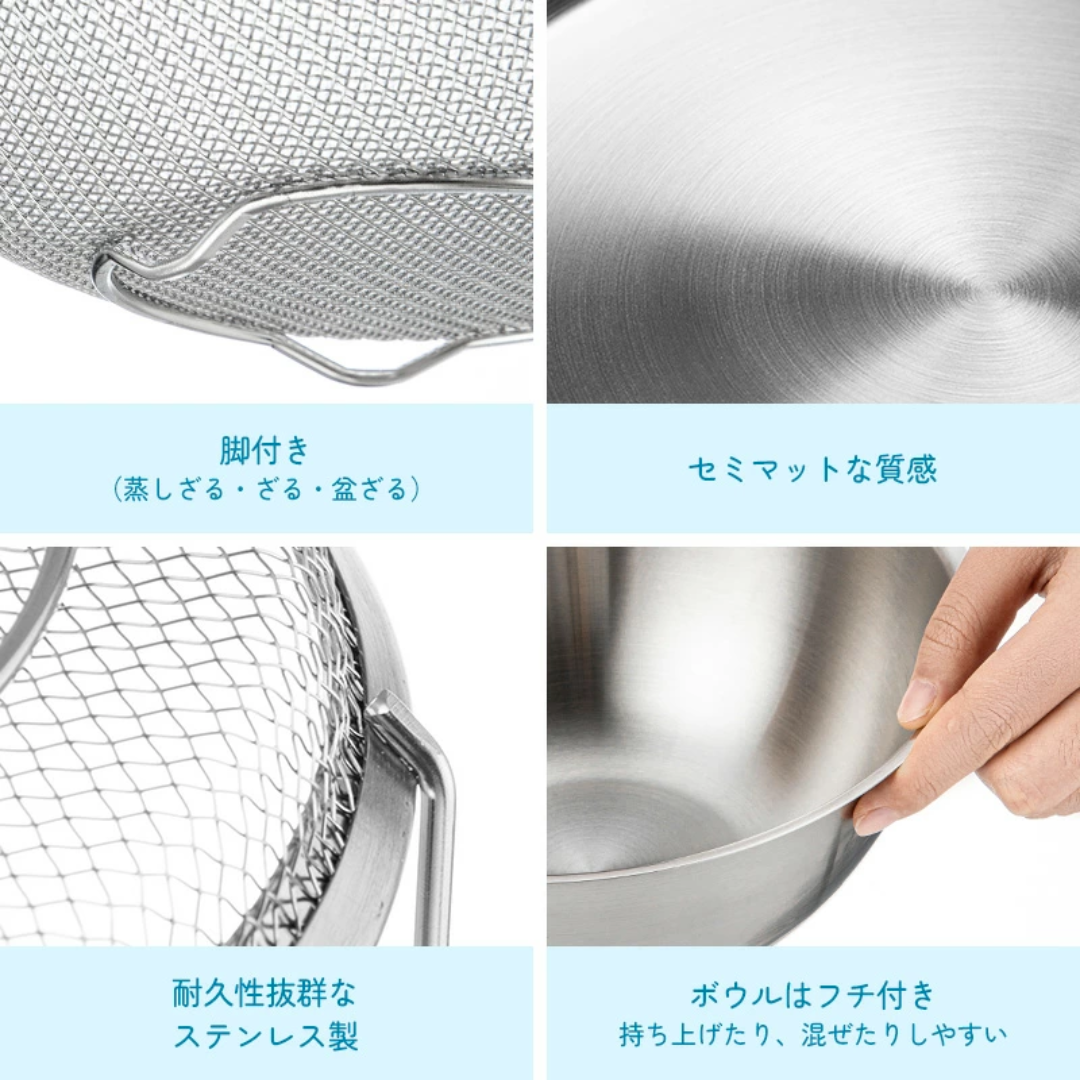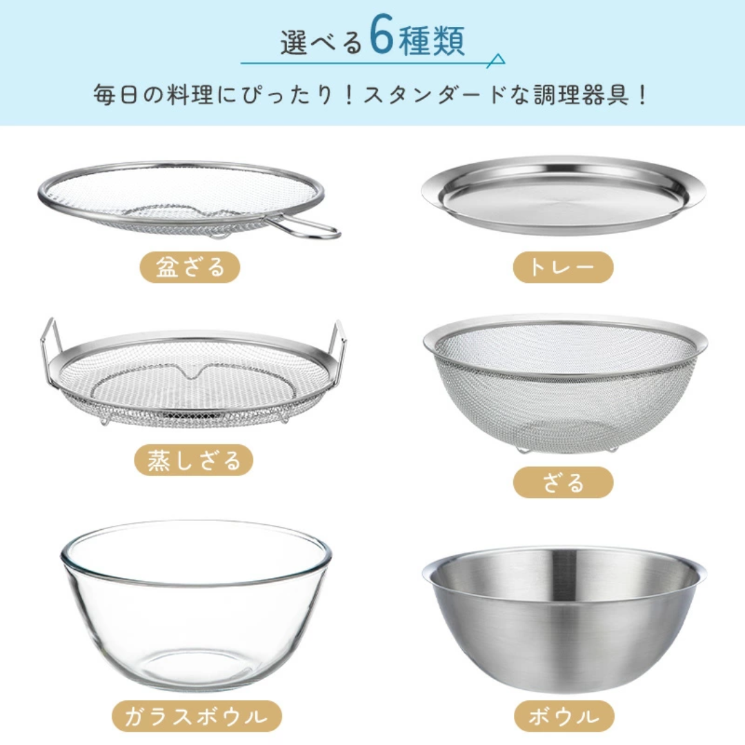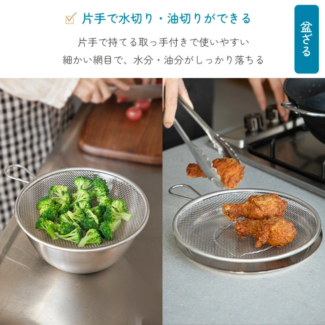 細緻的網眼能徹底瀝乾水分,防止米飯等細小食材卡住。深槽設計即使攪拌大量食材也能防止溢出。可用於盛裝甜點和菜餚,或作為濾網的托盤。與碗組合使用即可作為蓋子。可直接收納。