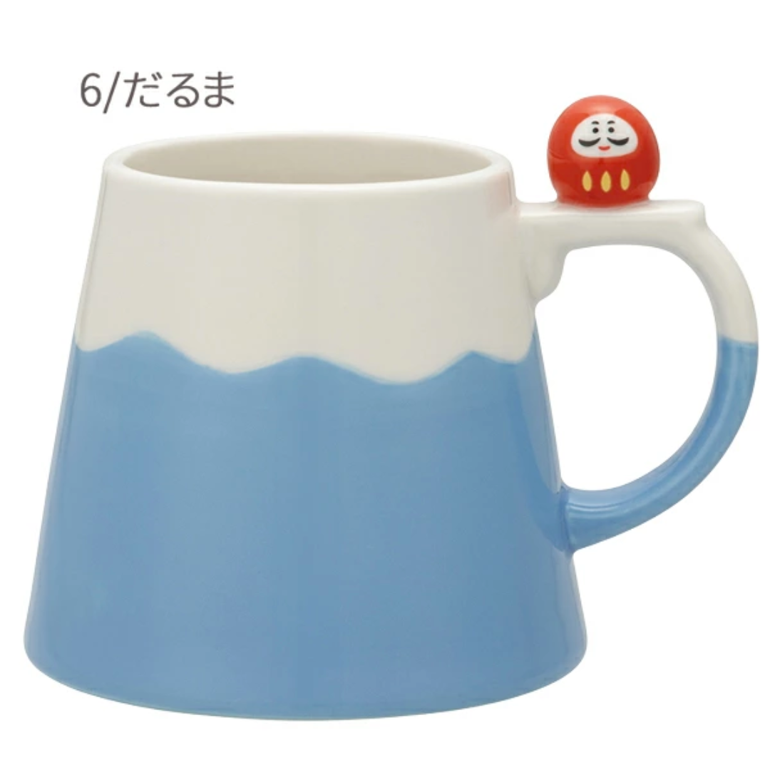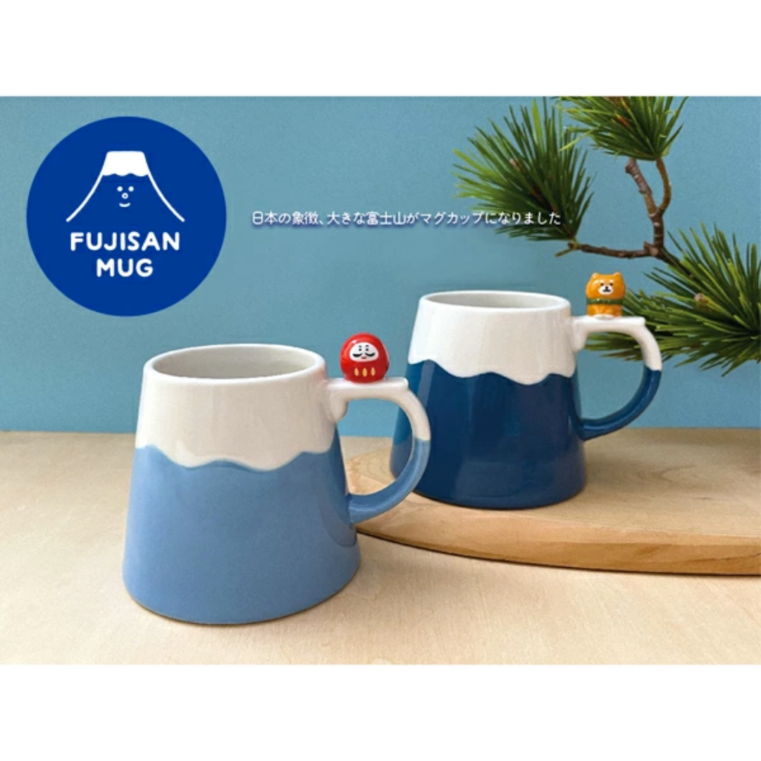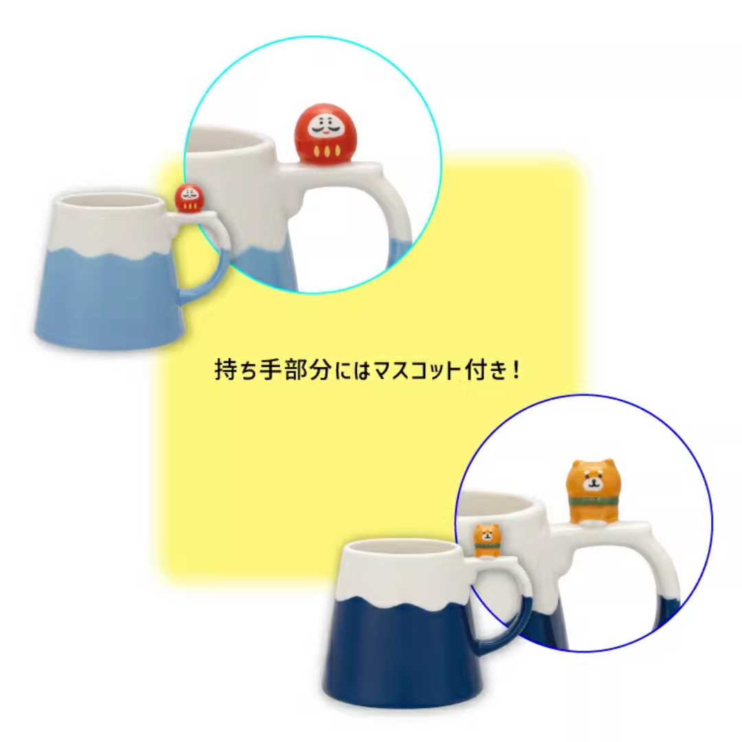 這款馬克杯以日本的象徵-富士山為主題,杯柄上分別飾有可愛的達摩不倒翁和柴犬~