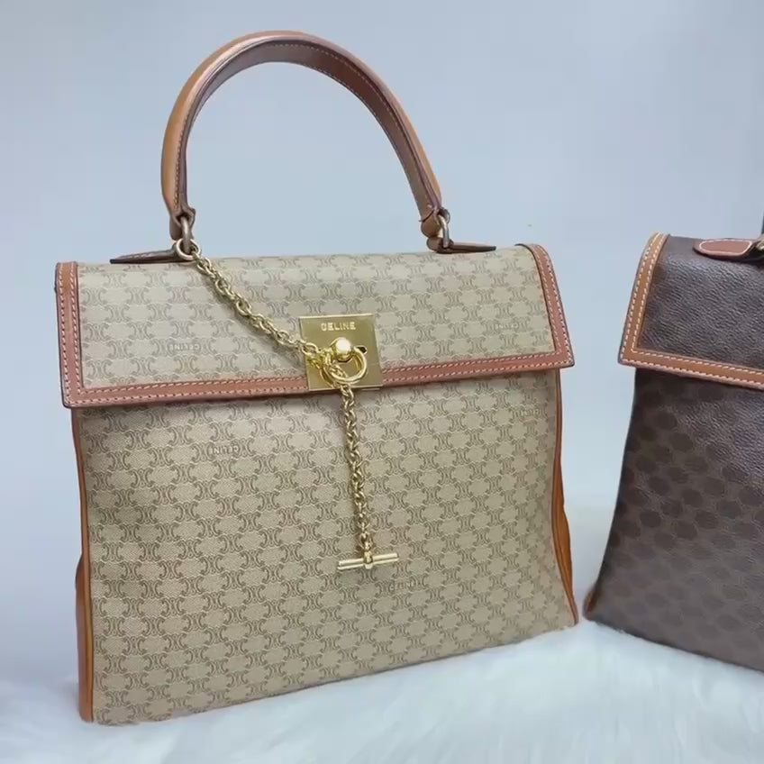 超復古的淺色Celine Macadam❤️整體狀態很不錯,超特別的手袋開關小金鏈設計,是中古的Celine屬有~